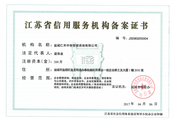 - 江蘇省信用服務(wù)機(jī)構(gòu)備案證書